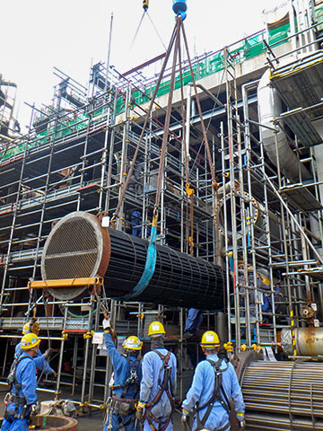 なかでも当社は重量物機器の据付撤去工事、静機器修理工事、鳶工事を得意としております。