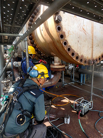 タワー・圧力容器・熱交換器などの静機器の修理、保全を行います。特に反応塔の触媒交換作業を得意としています